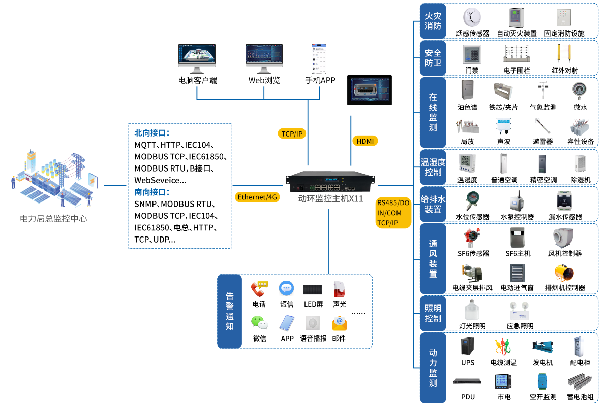 南向支持:SNMP/MODBUS RTU/MODBUS TCP/IEC104/IEC61850/电总/HTTP/TCP/UDP等多种协议对接