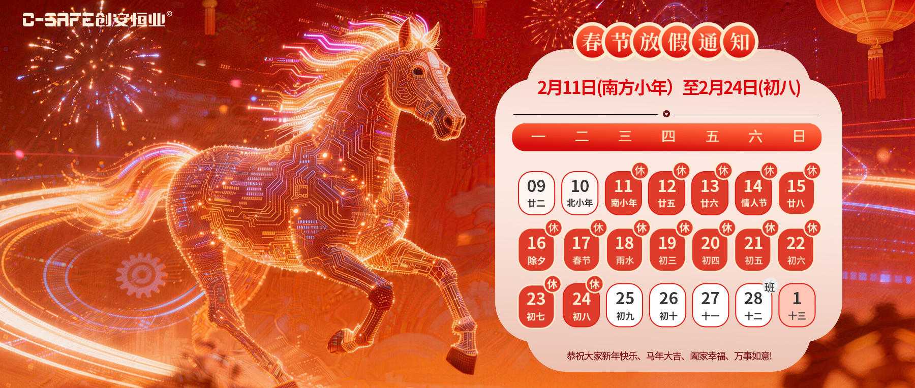 创安恒业 2026 年春节放假通知 尊敬的客户: 您好! 新春将至,首先感谢您在过去一年里对创安恒业的信任与支持。结合国家法定节假日及...