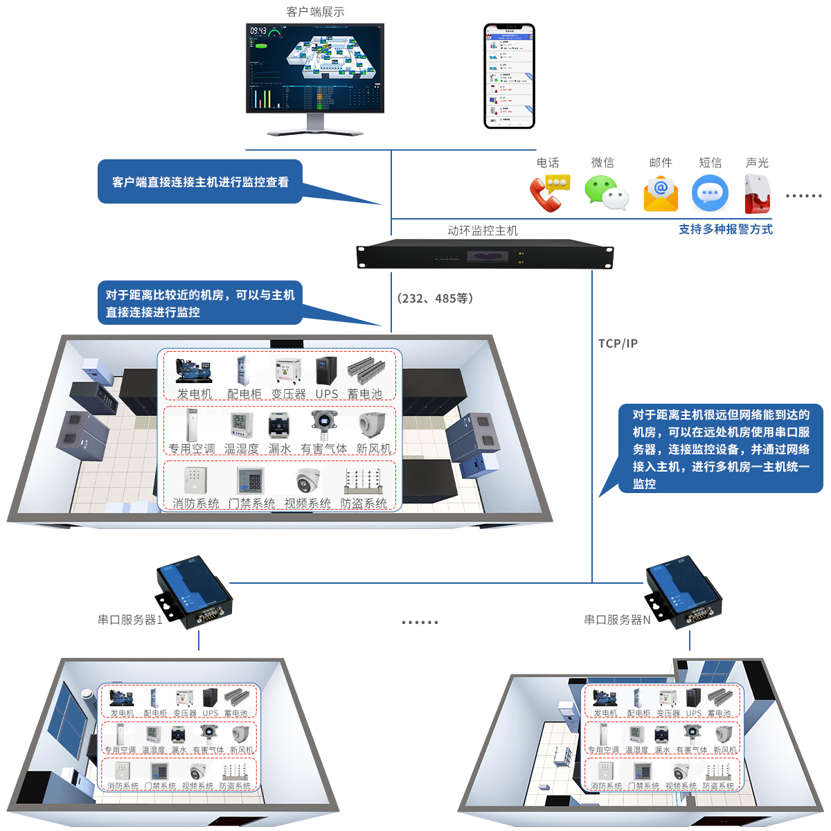 距离相隔较远,但是有网络可以互通的多个机房,可以配合串口服务器共用一套监控主机进行监控。比如某企业需要同时对总部机房以及相隔很远但是网络可达的工厂车间进行监控,可以使用该模式。