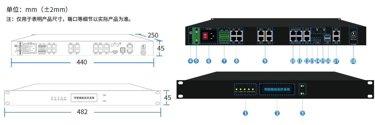 | 告警输入 | 8路光耦隔离开关量输入, RJ45物理接口,带12V供电; 8路模拟量输入,RJ45物理接口 | 告警输出 | 5路告警输出,其中3路12V光耦输出,2路10A继电器控制 |