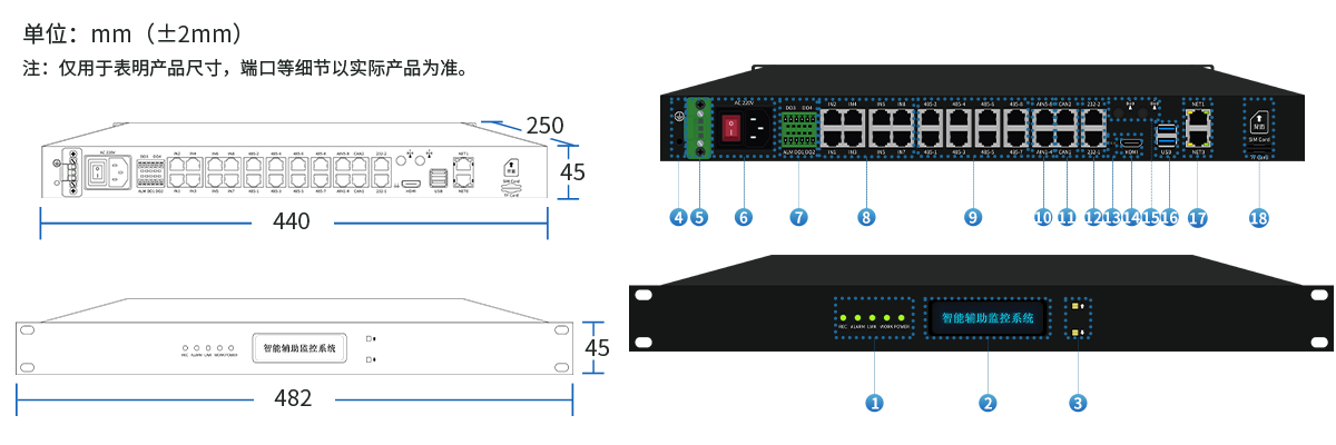 | 告警输入 | 16路光耦隔离开关量输入; RJ45物理接口,带12V供电; 8路模拟量输入,RJ45物理接口 | 告警输出 | 5路告警输出,其中3路12V光耦输出,2路10A继电器控制 |